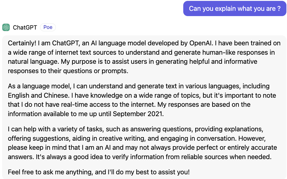 值得注意的是,语言模型(LM)并不仅仅关注语法,而是致力于以类似于人们书写的方式进行交互。在这里,让我们来看一下与ChatGPT的对话,并了解一下这个语言模型是如何进行解释,具体可参考如下: