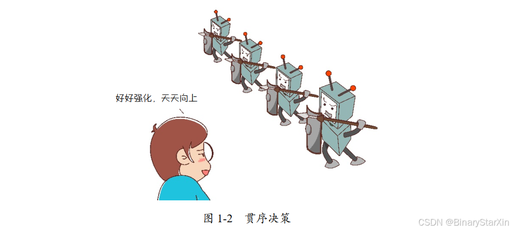 强化学习的主要目的是研究并解决机器人智能体贯序决策问题。 尽管我不喜欢直接把定义硬邦邦、 冷冰冰地扔出来让大家被动接受,可还是免不了要在这里猛然给出“贯序决策”这么专业的词汇。 好在, 很快我就能通过例子把这个词汇给大家解释清楚了。既然大家要么是程序员, 要么正走在程序员养成的路上, 要么正看着其他人走在程序员养成的路上, 那么, 按照程序员的思维来理解强化学习将会更加顺畅。