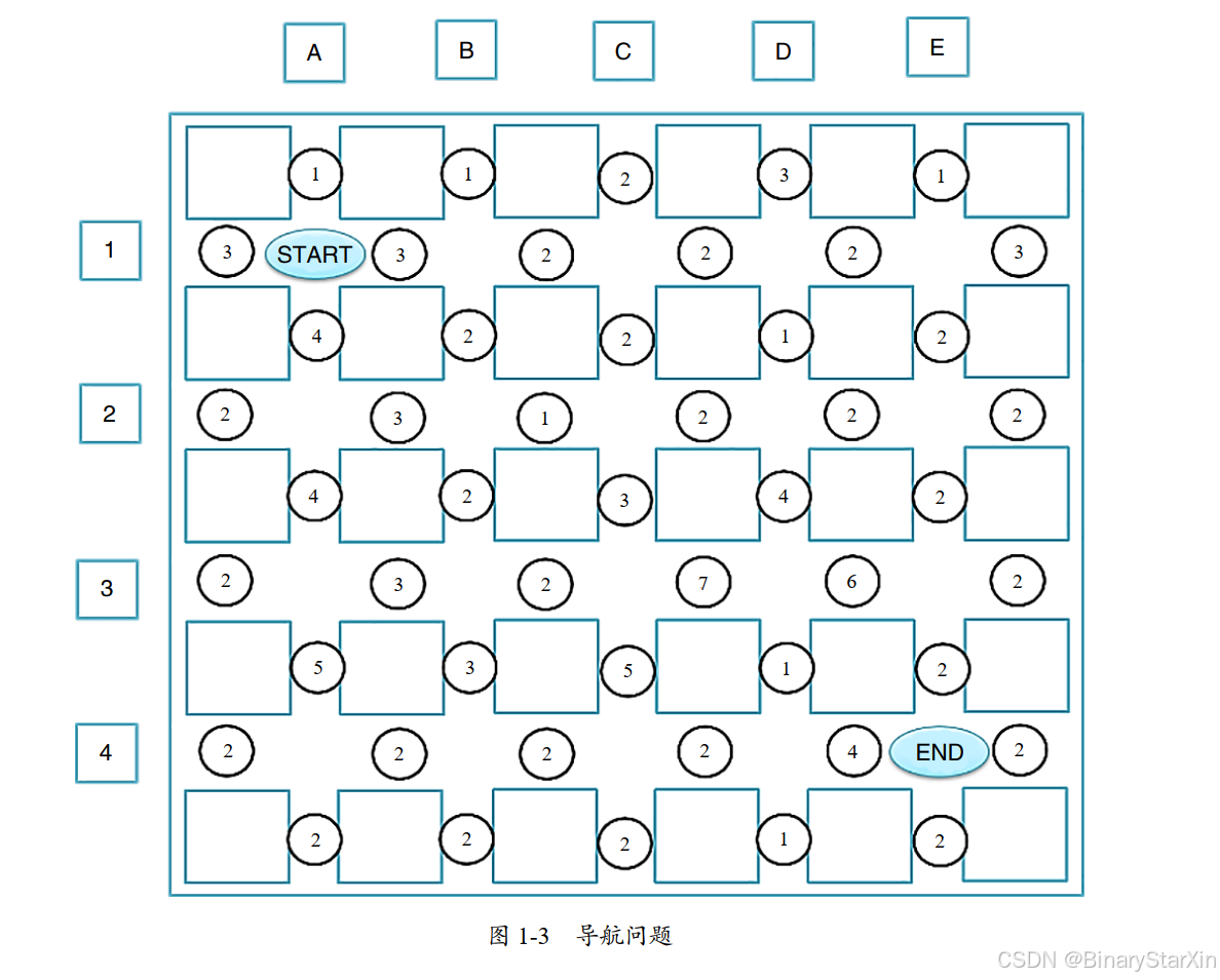 为了简化问题,假设我所在城市的道路是横平竖直的, 各街区的边长相等, 如图 1-3 所示。外侧的边框表示城墙,车辆无法通过。中间的方块表示街区,街区和街区之间就是道路。为了称呼方便,我们用英文字母 A~ E 来标记纵向的道路,用数字 1~ 4 来标记横向的道路,并约定 A 大街和 1 大街交汇处的坐标为 A1(也就是 START 处)。 圆圈中的数字表示我们用 GPS 或者其他手段测算出来的当前道路的拥堵程度, 1 表示通畅, 9 表示拥堵, 也可以具象地将圆圈中的数字理解为通过某段道路需要 1 分钟到 9 分钟不等——总之,怎么理解简单怎么来。