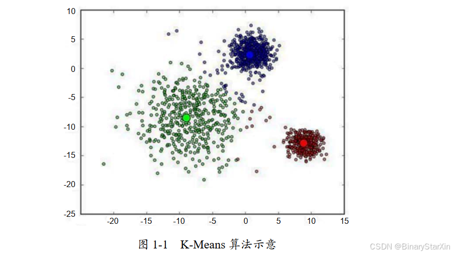 如图 1-1 所示, 空间中不均匀地分布着一些点, 通过 K-Means 算法可以计算出它们分别聚集在三个点周围( 或者说“聚成了三堆”)。