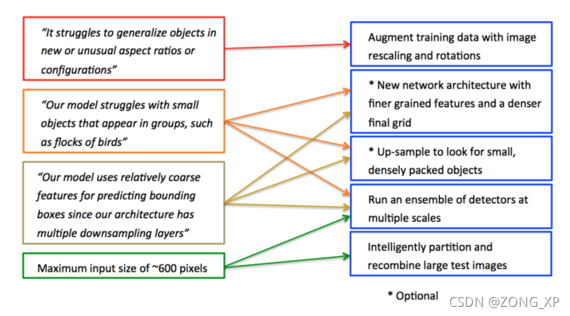 下面的Figure3详细展示了卫星图像目标检测的主要几个难点以及YOLT的解决方案,左边这一列代表难点,右边则代表YOLT提出的方法。