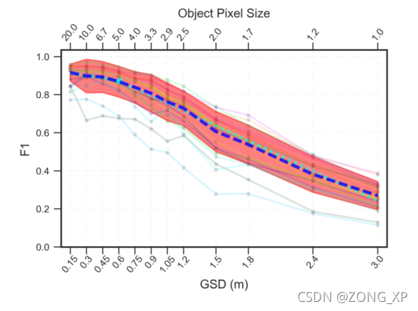 然后Figure13将不同分辨率输入下检测模型的F1值进行了图表量化,其中横坐标代表目标的像素尺寸。可以看到,随着分辨率的降低,图像中目标的像素尺寸也越来越小,检测效果(F1值)也越来越低。