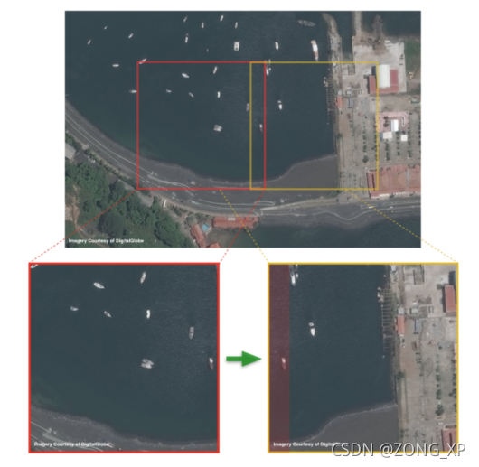 上半部分表示的是原始的卫星图片,因为图片分辨率太大,所以采用了划窗方式裁剪指定尺寸如416 × 416 416\times 416416×416的图像作为模型的输入,论文将裁剪后的区域称为chip,并且相邻的chip会有15%的重叠,这样做的目的是为了保证每个区域都能被完整检测到,虽然这带来了一些重复检测,但可以通过NMS算法滤掉。通过这种操作,一张卫星图像会被裁剪出数百/千张指定尺寸的图像,这些图像被检测之后将检测结果合并经过NMS处理后就可以获得最终的检测结果了。