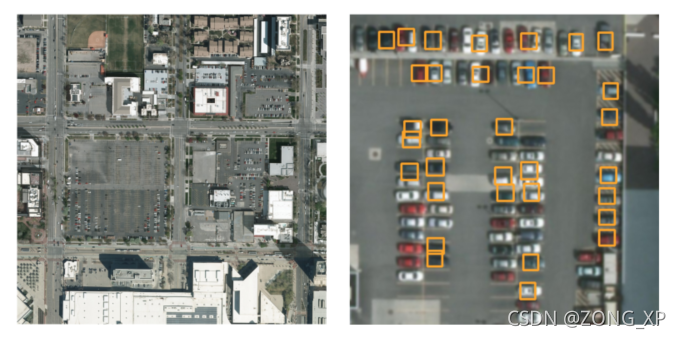 下面的Figure2展示了使用两种不同类型的图像作为输入时模型(原始的YOLOv2)的预测结果对比,左边是直接把卫星图像原图resize到416 × 416 416\times 416416×416大小,可有看到结果是一辆车都检测不出来。右边则是从原图中裁剪出416 × 416 416\times 416416×416大小的区域然后作为模型的输入,可以看到部分车被检测出来了,但是效果一般。从这个实验可以发现,如果直接将原图resize到网络输入大小是不靠谱的,所以YOLT采用了裁剪方式进行训练和测试图片。