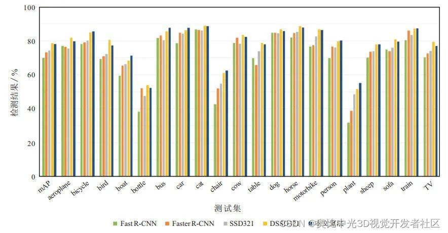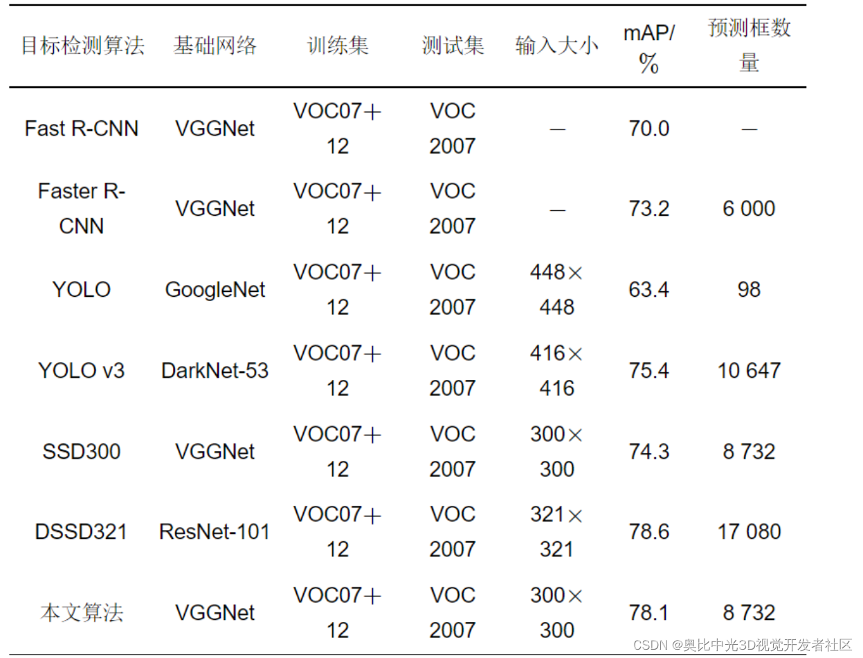 表 1给出了Fast R-CNN[3]、Faster R-CNN[5]、YOLO[6]、YOLO v3[9]、SSD300[11]、DSSD321[20]以及本文算法的目标检测精度.