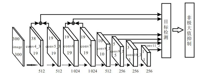 SSD网络分别在conv4−−3至conv11的6层特征图上进行分类回归, 即使用conv4−−3、conv7、conv8−−2、conv9−−2、conv10−−2和conv11−−2这6层特征图进行检测, 较大的特征图用来检测相对较小的目标, 而较小的特征图负责检测较大的目标[11].