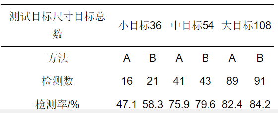 为验证本文算法对不同大小目标的检测精度, 实验中随机选取100张图片, 其中包含198个目标, 将其分为大、中、小三类. 由于该网络的输入图像尺寸为300××300, 将图像中的检测目标按照其面积占图像总面积的比例分为三类: 目标面积占图像总面积5 %以下的认为是小目标, 目标面积占图像面积5 % ∼∼ 25 %的是中等目标, 目标面积占图像总面积20 %以上的是大目标. 表 2给出了SSD算法和本文算法的检测结果(其中: A方法为SSD算法, B方法为本文算法).