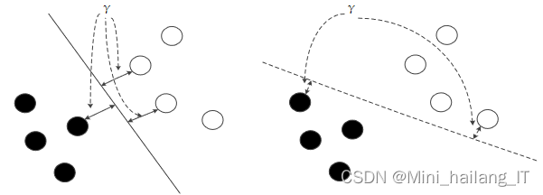 SVM(支持向量机)是一种非概率分类器,用于解决二分类问题。其核心思想是通过最大化间隔来构建最优的决策边界,以获得更高的可信度和泛化能力。对于线性可分情况,SVM通过寻找能够正确分割两个类别的超平面,并使该超平面与最近样本点之间的间隔最大化。这样的间隔被定义为γ,最大化γ可以找到具有更好分割效果的边界,提高了分类器的准确性和稳定性。对于线性不可分情况,SVM使用核函数将样本数据从低维空间映射到高维特征空间,使其在高维空间中线性可分。通过这种映射,SVM能够处理更为复杂的数据分布,提高了分类的能力和灵活性。