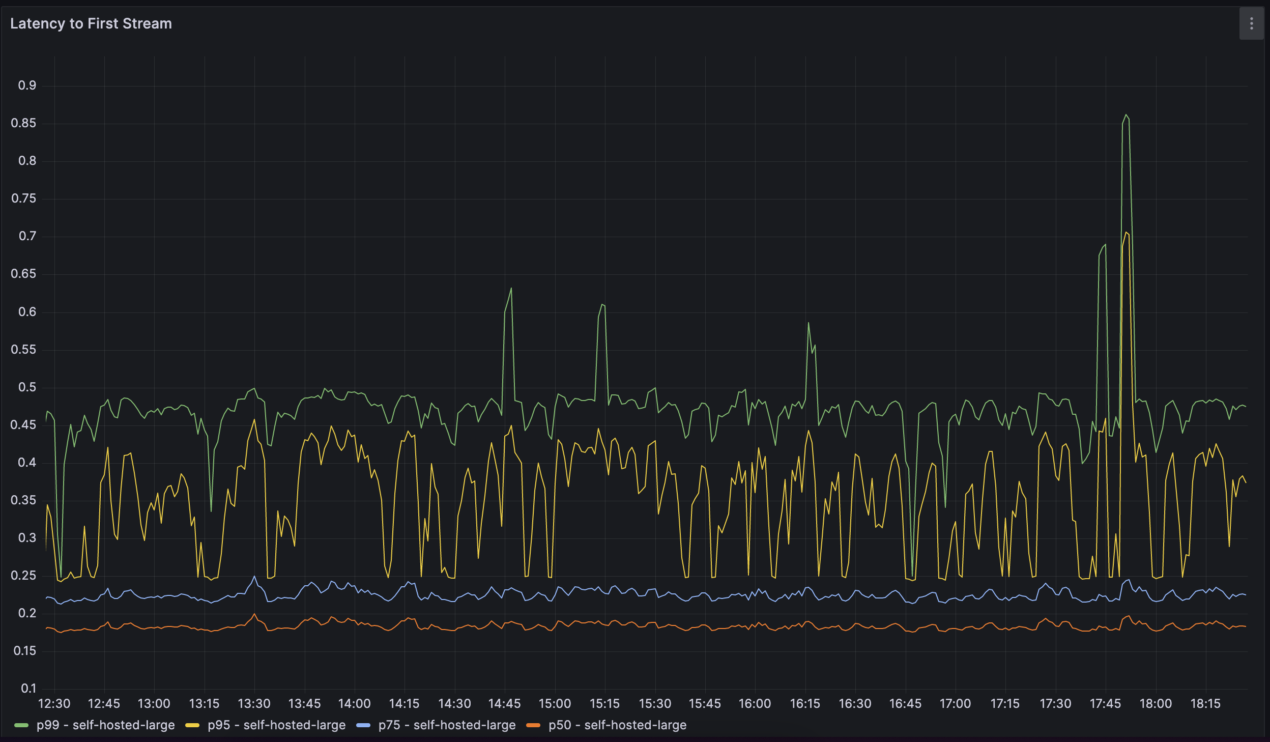 在将我们的模型部署到生产环境中后,我们能够使用我们的 Kubernetes 基础设施对其进行自动缩放以满足需求。尽管我们在之前的博文中讨论过自动缩放,但值得一提的是,托管推理服务器会带来一系列独特的挑战。这些包括大型工件(即模型权重)和特殊硬件要求(即不同的 GPU 大小/数量)。我们设计了我们的部署和集群配置,以便我们能够快速可靠地交付。例如,我们的集群旨在解决个别区域的 GPU 短缺问题,并寻找最便宜的可用节点。