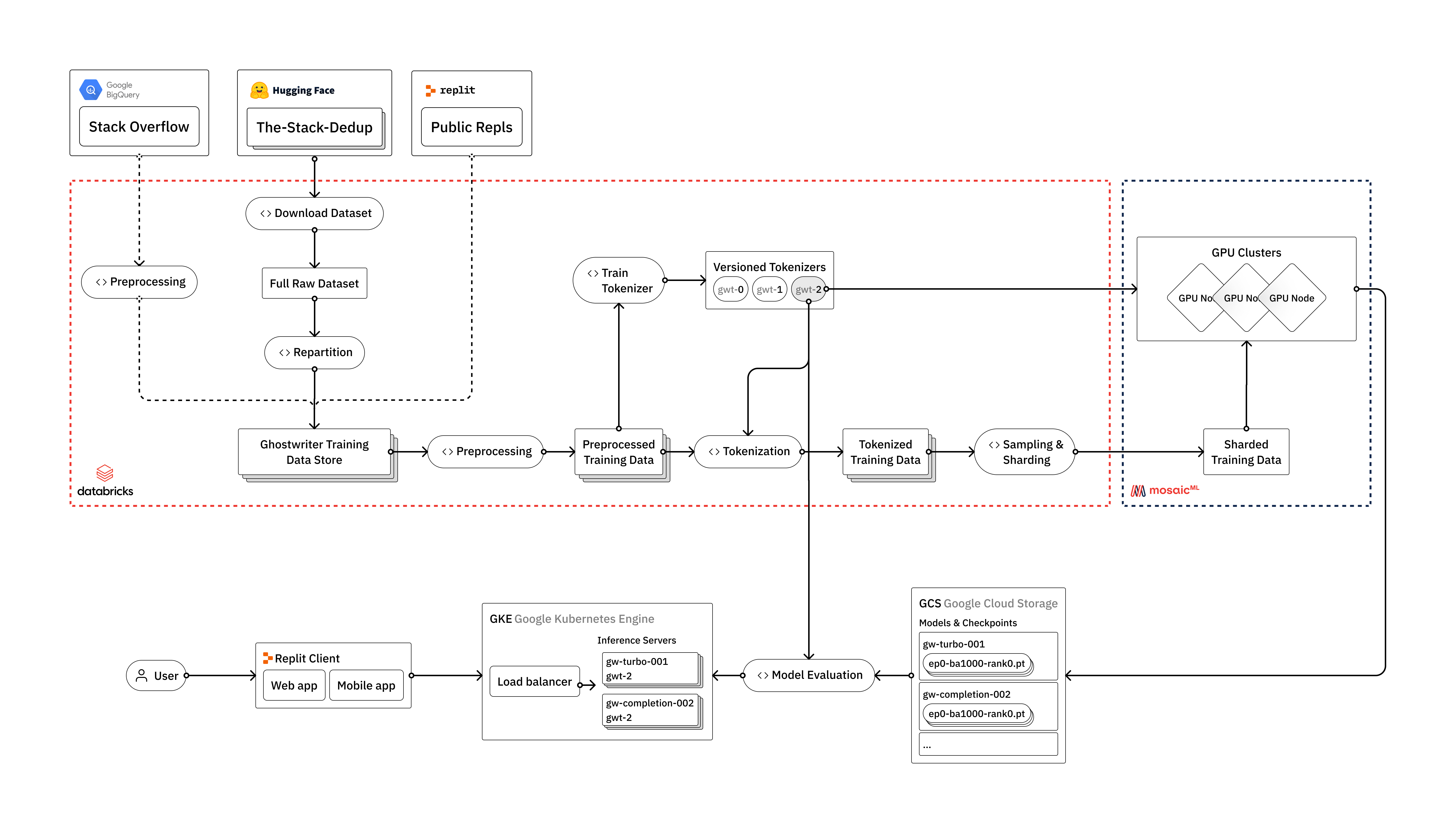 在 Replit,我们大量投资于从头开始训练我们自己的大型语言模型所需的基础设施。在这篇博文中,我们将概述我们如何训练 LLM,从原始数据到面向用户的生产环境中的部署。我们将讨论我们在此过程中面临的工程挑战,以及我们如何利用我们认为构成现代 LLM 堆栈的供应商:Databricks、Hugging Face 和 MosaicML。