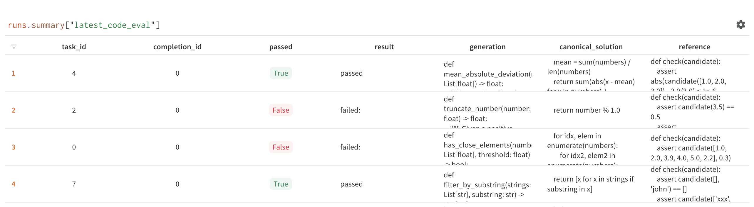 为了测试我们的模型,我们使用 Chen 等人中描述的 HumanEval 框架的变体。(2021)。给定函数签名和文档字符串,我们使用该模型生成一段 Python 代码。然后,我们对生成的函数运行测试用例,以确定生成的代码块是否按预期工作。我们运行多个样本并分析相应的Pass@K数字。