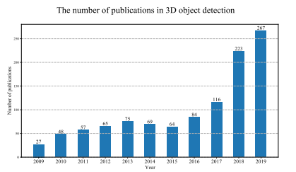 (a) 自2009年以来,3D对象检测方面的出版物数量不断增加到2019年。
