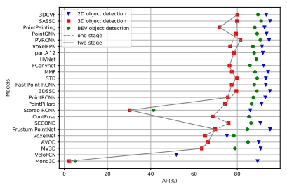 对于每种最先进的方法,中等难度的汽车类别在2D、3D和BEV目标检测方面的表现。2D对象检测绘制为蓝色三角形,BEV对象检测绘制为绿色圆圈,3D对象检测绘制为红色正方形。两阶段方法绘制为实线,一阶段方法绘制为虚线