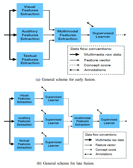 深度神经网络利用自然信号的成分层次特性,其中融合策略可能有所不同,通常存在两类融合方案,即早期融合和晚期融合,前者在输入监督学习者之前结合了多模态特征,而后者则整合了单独训练的监督学习者获得的语义特征,如下图所示:
