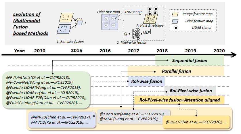 基于多模态融合方法的发展:1)RoI融合,2)像素融合。