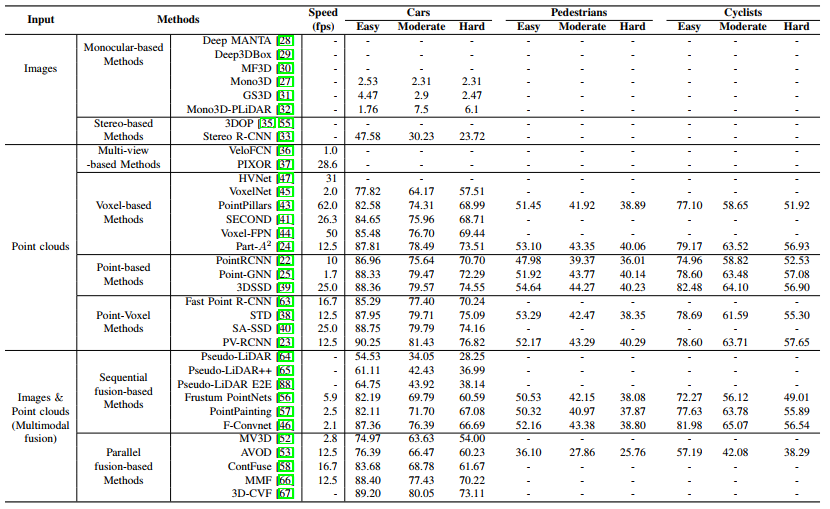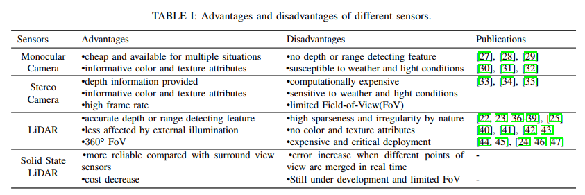 总之,基于单目/立体图像的方法各有优缺点。这些方法仅将图像作为输入,提供颜色属性和纹理信息,由于缺乏深度信息,一种可能的补救方法是研究深度估计算法,对于自动系统来说,除了经济方面的考虑外,冗余对于保证安全是必不可少的,因此基于图像的方法将在未来几年产生持续的影响。