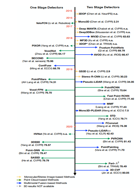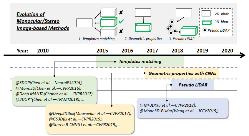 基于单目/立体图像的方法的发展:1)模板匹配,2)几何特性,3)伪激光雷达