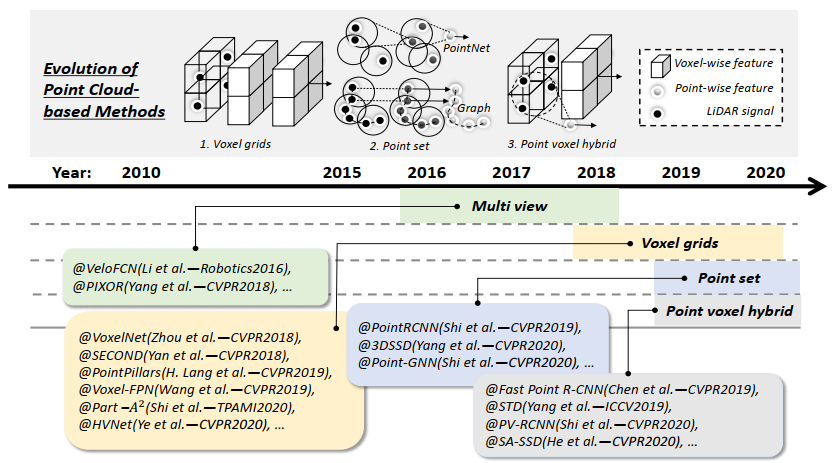 基于点云3D目标检测方法的发展:1)体素网格,2)点云,3)点云+体素混合。