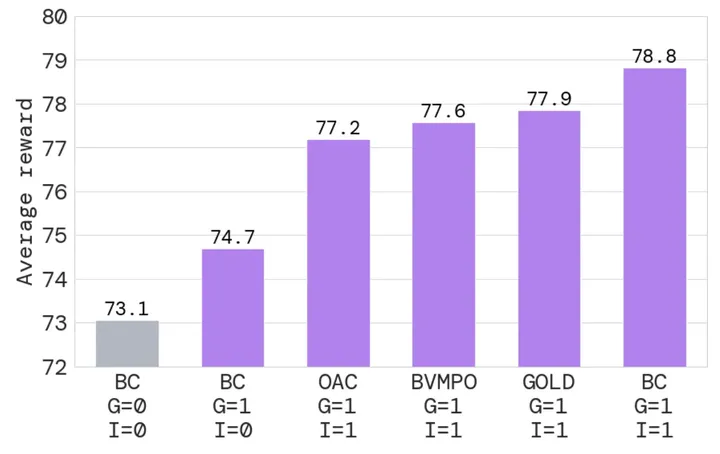 在下图中作者展示了本文方法与监督训练模型,以及使用不同损失函数的ReST变体的平均奖励分数对比,可以观察到,即使只使用单次Grow步骤,ReST的不同变体(紫色)也显着优于监督学习模型(灰色)得到的奖励分数。