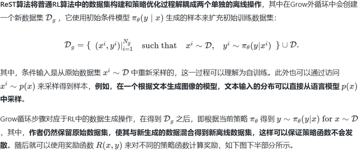 其中外循环称为Grow循环,模型会根据当前的策略来采样生成一个对齐数据集,内循环称为Improve循环,模型会对外循环生成的数据集进行过滤(使用人类偏好评分函数对样本进行排序过滤),并将过滤后的数据继续用于微调优化策略,内外循环相互影响,以降低采样数据带来的训练成本。ReST不再依赖在线的RL损失,因而成为了一种通用的强化学习框架,允许在执行Improve循环时使用不同的离线RL损失,使整体框架更具灵活性。