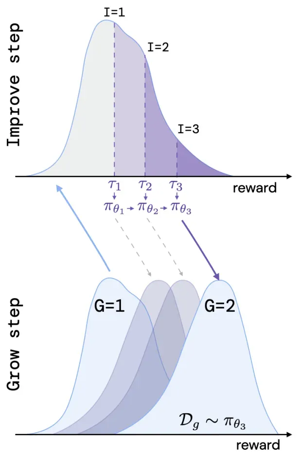 可以看到,在线PPO算法的平均奖励分数基本与ReST算法持平,但是这只是在单次Grow步骤的情况下,当ReST使用多步Grow和Improve后(并且参与训练的数据量相同),性能会得到显著的提升。