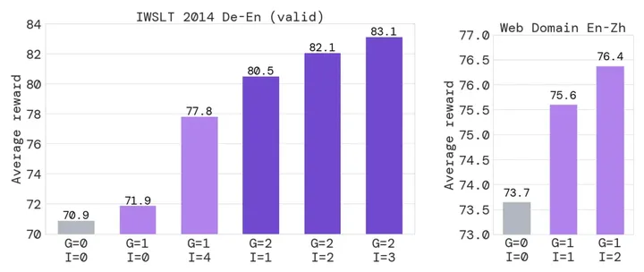 Grow步骤可以不断增加离线训练的样本数量,因此作者对比了执行单次Grow步骤和执行两次Grow步骤后的模型性能,如下图所示,执行两次Grow步骤的ReST变体在IWSLT 2014和Web Domain数据集上都有明显的提升。