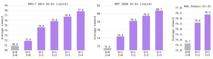 可以看到,随着Improve steps数量的不断增加,ReST在所有三个数据集上的平均奖励分数都得到了提高。
