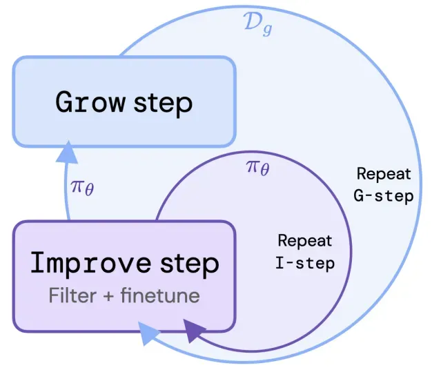 如何将LLMs的输出与人类偏好或价值观进行高效的对齐,是目前提升LLMs性能的关键问题,如果没有进行适当的对齐处理,LLMs可能会产生风险高或完全错误的内容,这对于下游应用程序具有毁灭性的影响。目前常用的RLHF方法通常使用人类反馈的标注数据来学习一个奖励模型,然后将其用于强化学习目标来对LLM进行微调对齐。但是RLHF通常依赖于在线RL方法,例如PPO[1]和A2C[2],这就需要在模型训练过程中多次使用奖励模型来从更新后的策略中采样新样本,这会带来高昂的计算代价。为了解决这一问题,本文提出了一个自训练强化学习算法ReST,ReST将人类标注员从反馈训练循环中丢弃,自行生成并使用离线数据进行反馈训练。作者巧妙地设计了一个内外循环机制,如下图所示。