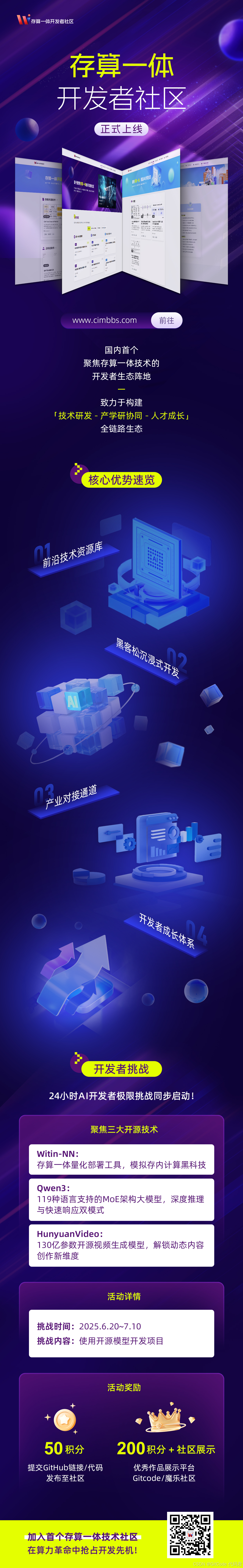 加入存算一体开发者社区,让你的创新想法与产业需求同频共振,在算力革命的征程中留下属于你的印记。同时及时发布存算一体技术领域的最新前沿技术和研究成果,让开发者第一时间了解行业动态,获取最新的技术资讯、研究报告和学术论文,拓宽技术视野,把握技术发展趋势。在这个充满机遇与挑战的时代,存算一体开发者社区将与你携手共进,共同推动存算一体技术的发展与应用,为 AI 硬件的未来贡献力量。无论开发者是初探存算模型