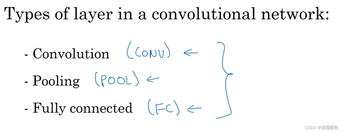一个典型的卷积网络通常有三层:一个是卷积层,常用 Conv(Convolution)标注;还有池化层,称为 POOL(Pooling);还有全连接层,用 FC(Fully connected)表示。