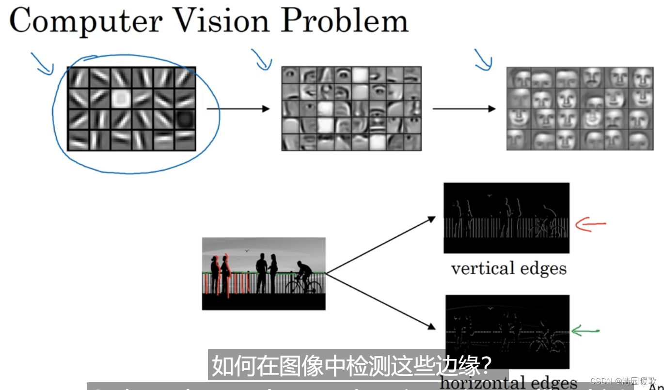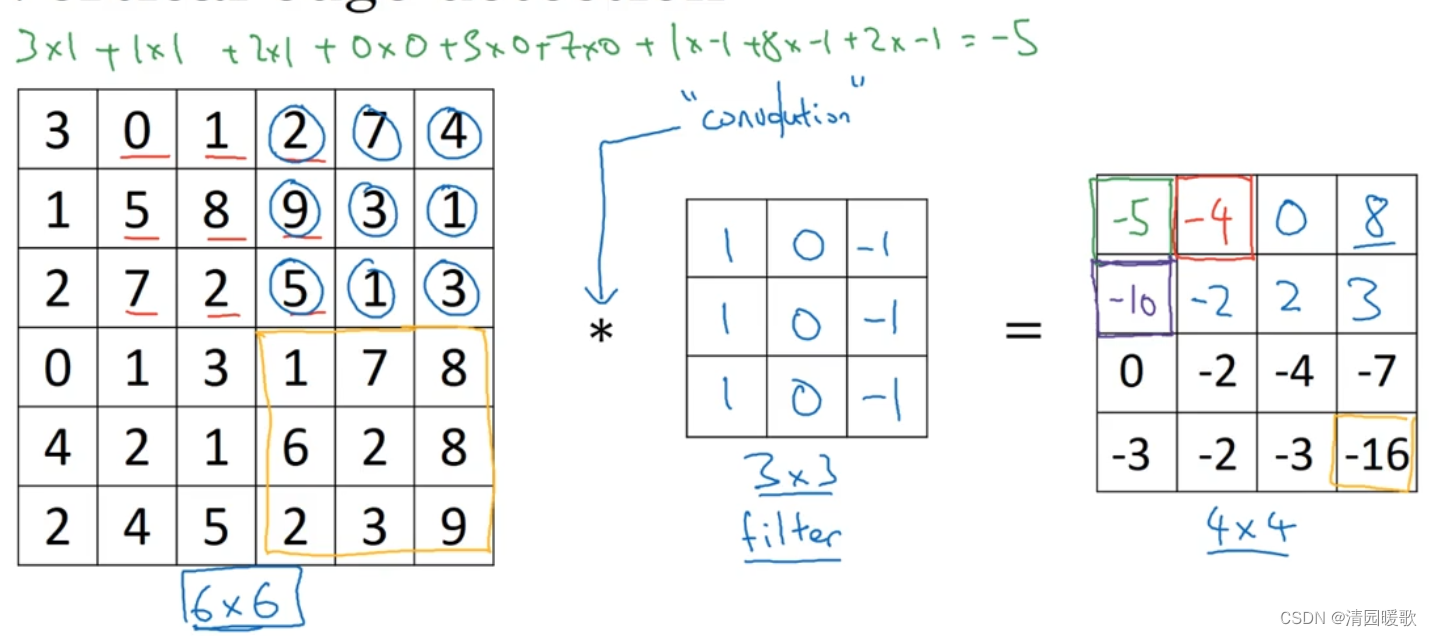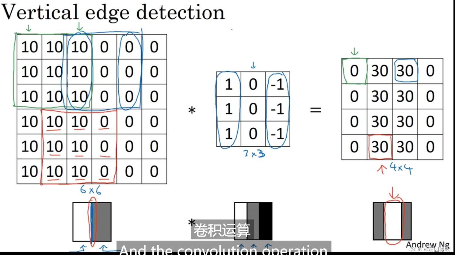 为了检测出这个 6 ×6 图像的垂直边缘,构建一个 3×3 的过滤器(filter),或者称为核,进行卷积运算 *,输出得到一个 4×4 的矩阵,里面元素的运算过程如下图所示,以第一行第一列的元素为例:这个即为:垂直边缘检测器不同编程框架下的卷积运算:python:conv_forward 函数tensorflow:tf.nn.conv2d 函数Keras:Conv2D 函数为什么这个可以做 垂直