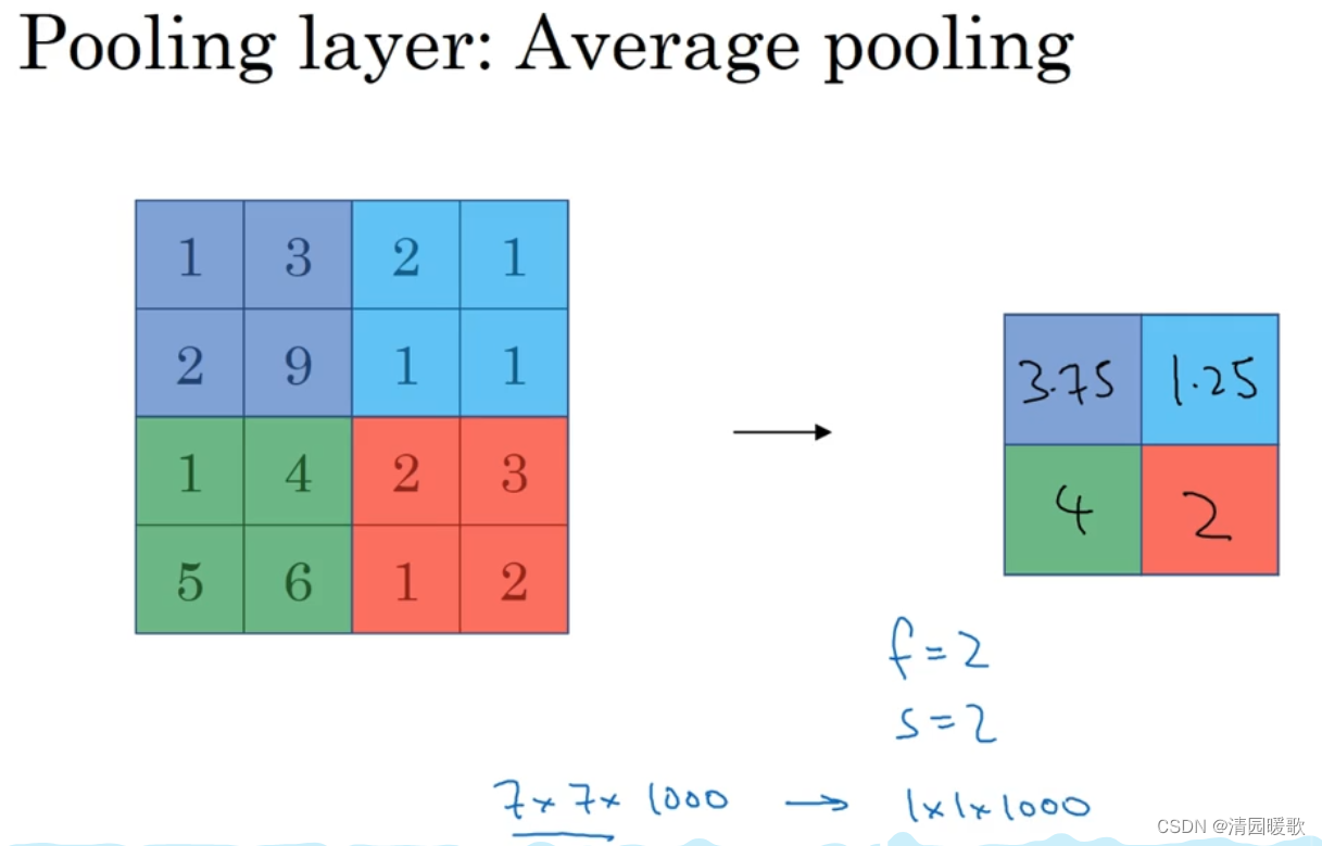 目前来说,最大池化必平均池化更常用,但也有例外,就是深度很深的神经网络,