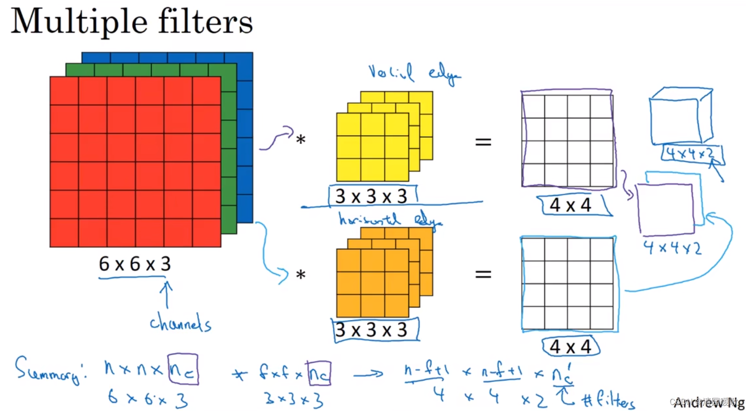 总结一下,一个 n×n×n_c * f×f×f_c = (n-f+1) × (n-f+1) × n_c' (n_c'是过滤器的个数),如果用了不同的步幅还会发生变化,所以,我们可以使用多个过滤器,来检测多个特征,并输出这些特征,输出的通道数就等于你要检测的特征数,