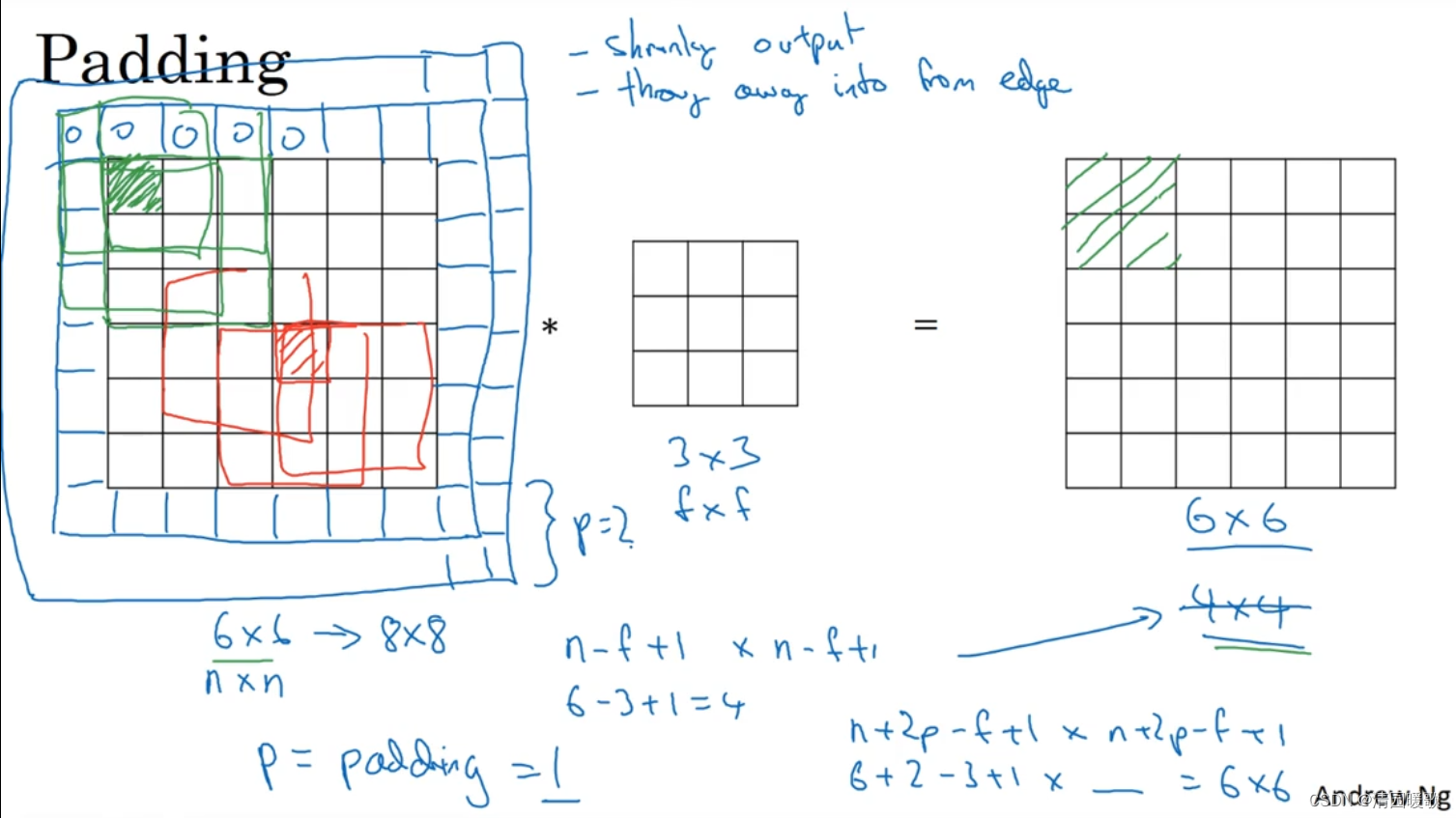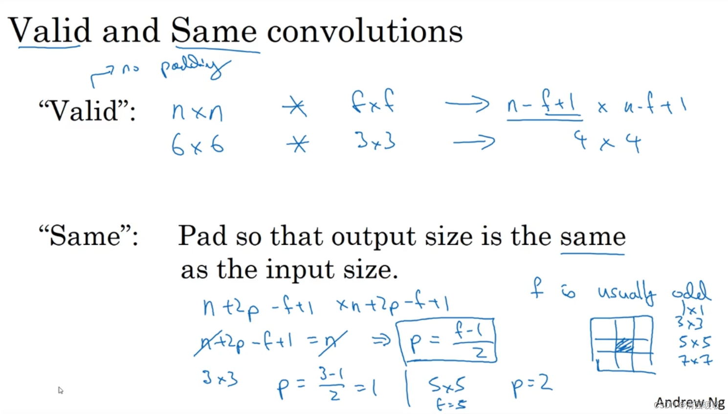 而要相等,则令: n = n+2p-f+1,=> p = (f - 1)/ 2