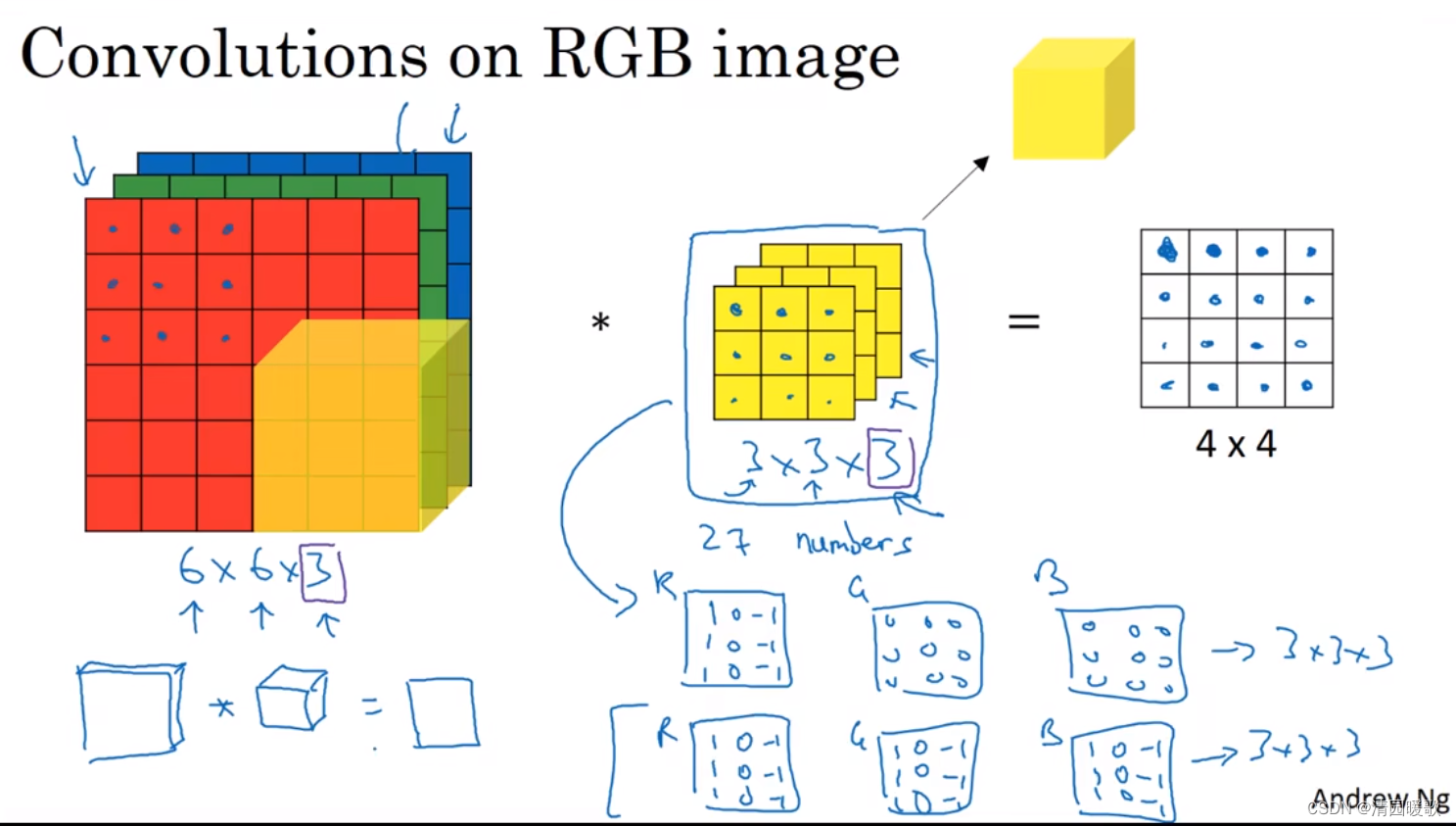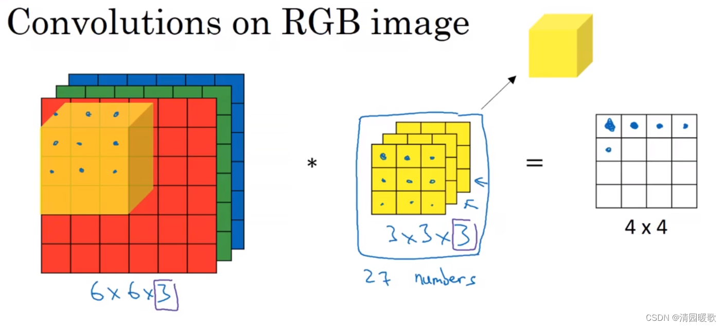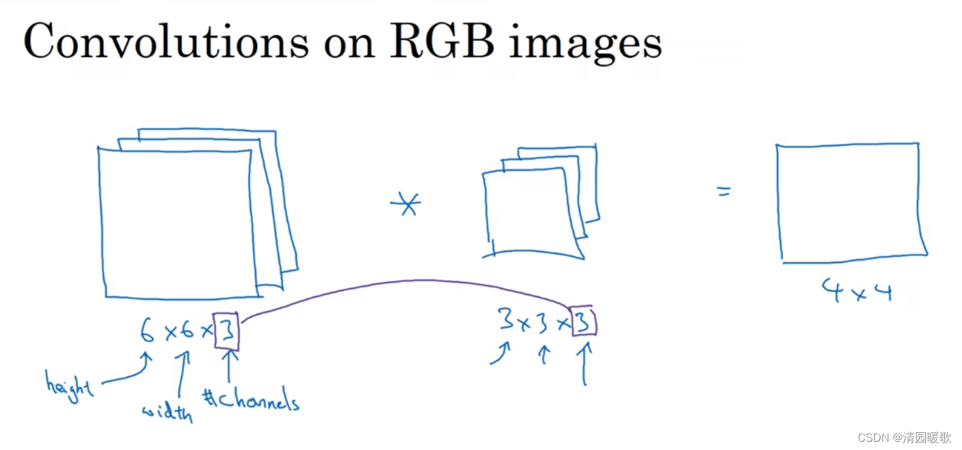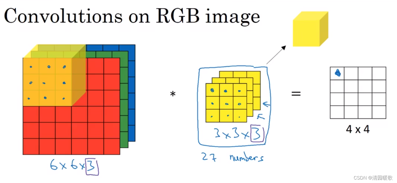 图像的通道数和过滤器的通道数必须要一致,如 6×6×6 * 3×3×3 = 4×4×1