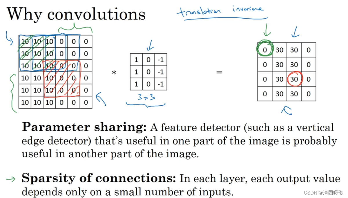(2)稀疏连接:输出的第一个元素只与输入的左上的3×3的9个元素有关,而其他像素无法影响这个输出的元素,这就是稀疏连接