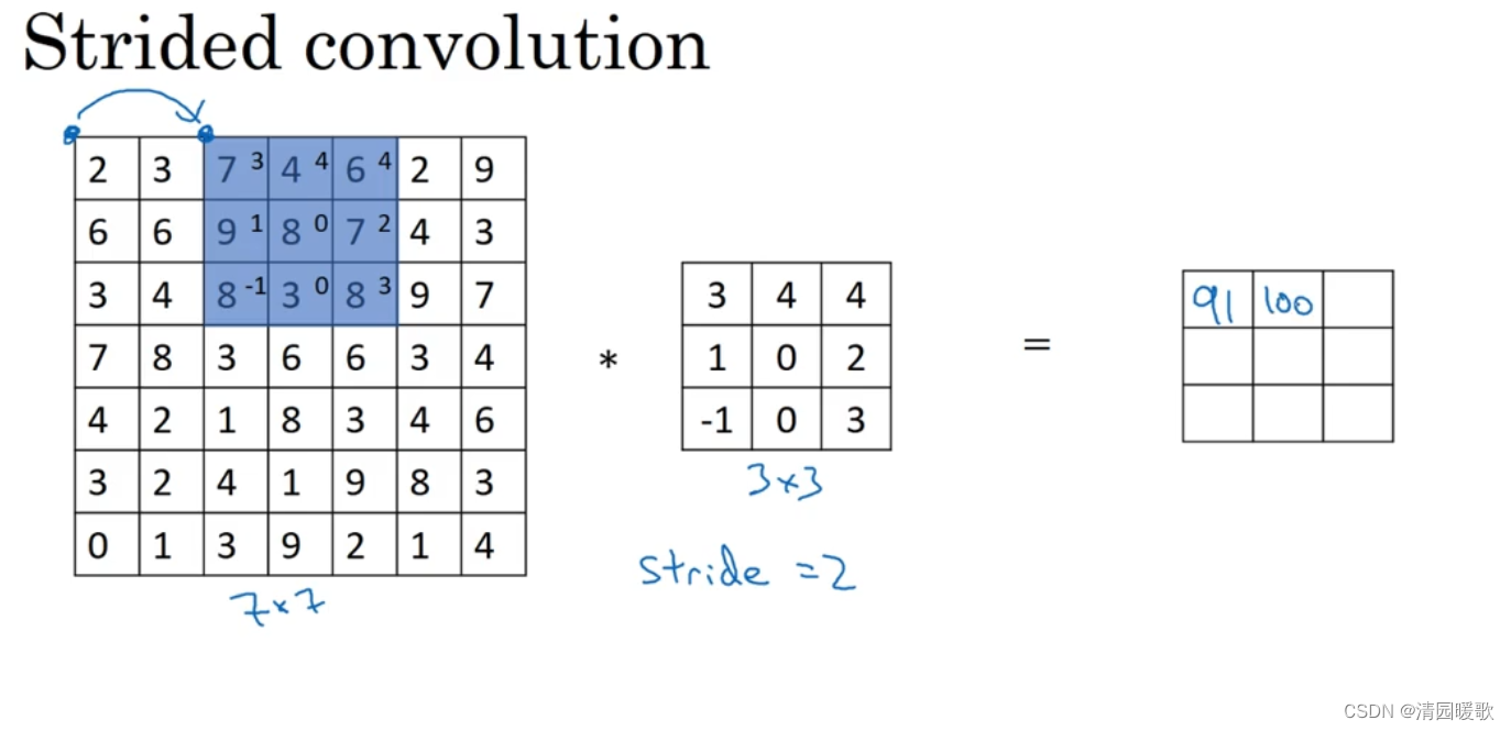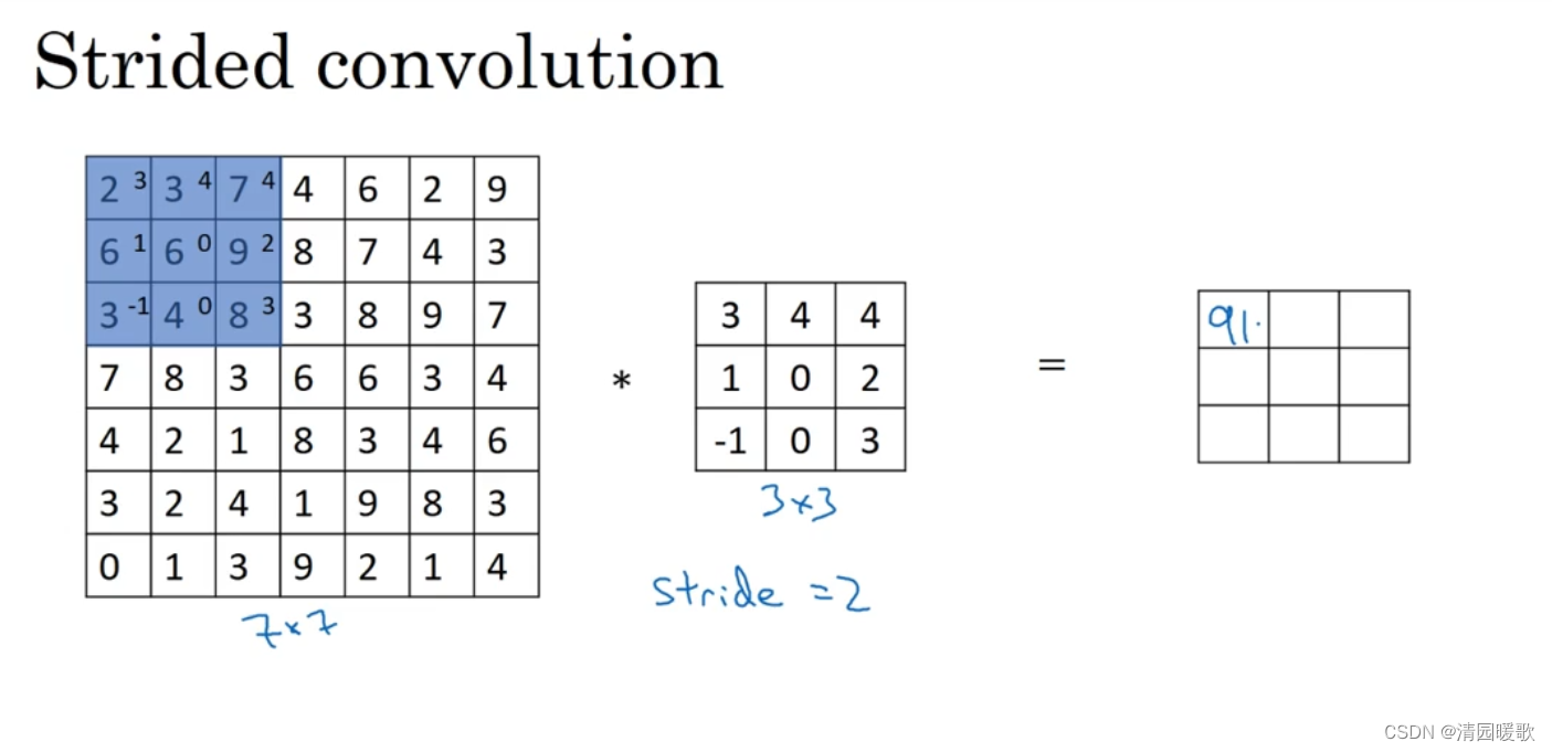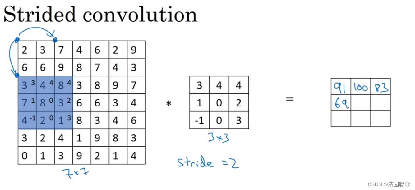 卷积中的步长(步幅)是另一个构建卷积神经网络的基本操作。初始步长为1,而步长为2时,也就是让过滤器再原图像上每次跳过2个步长,由第一个像素起始。下一次到第三个像素
