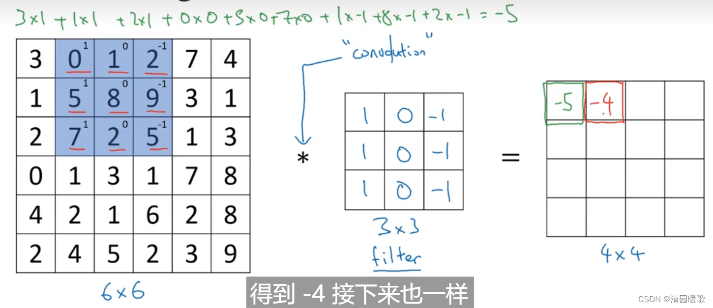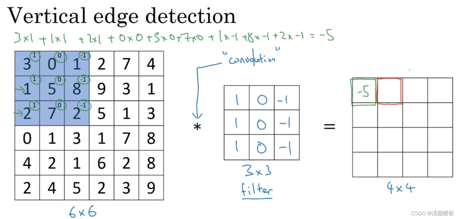为了检测出这个 6 ×6 图像的垂直边缘,构建一个 3×3 的过滤器(filter),或者称为 核,进行卷积运算 *,输出得到一个 4×4 的矩阵,里面元素的运算过程如下图所示,以第一行第一列的元素为例: