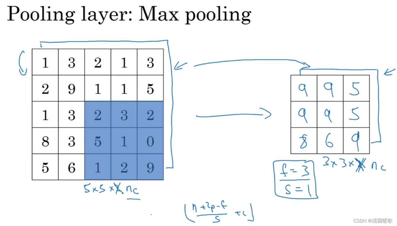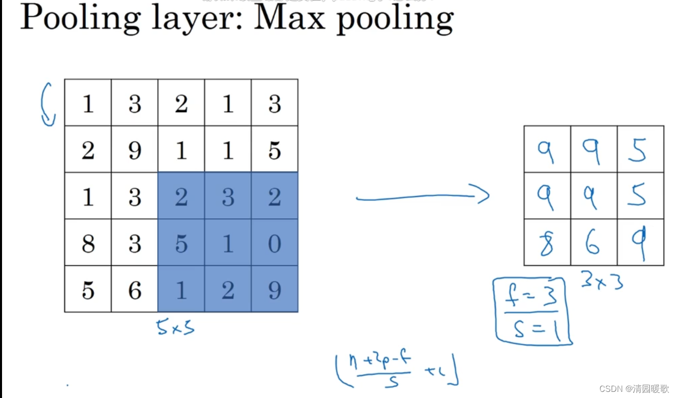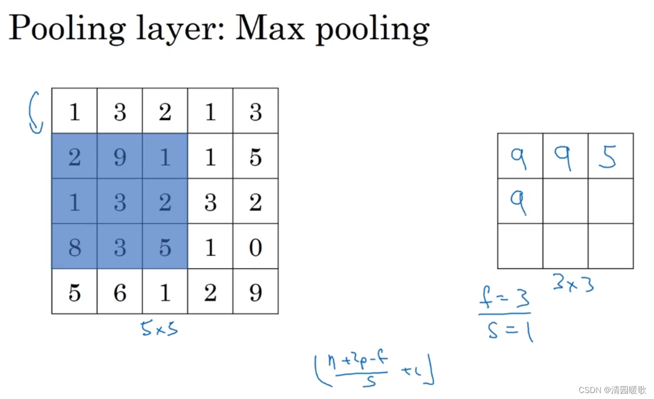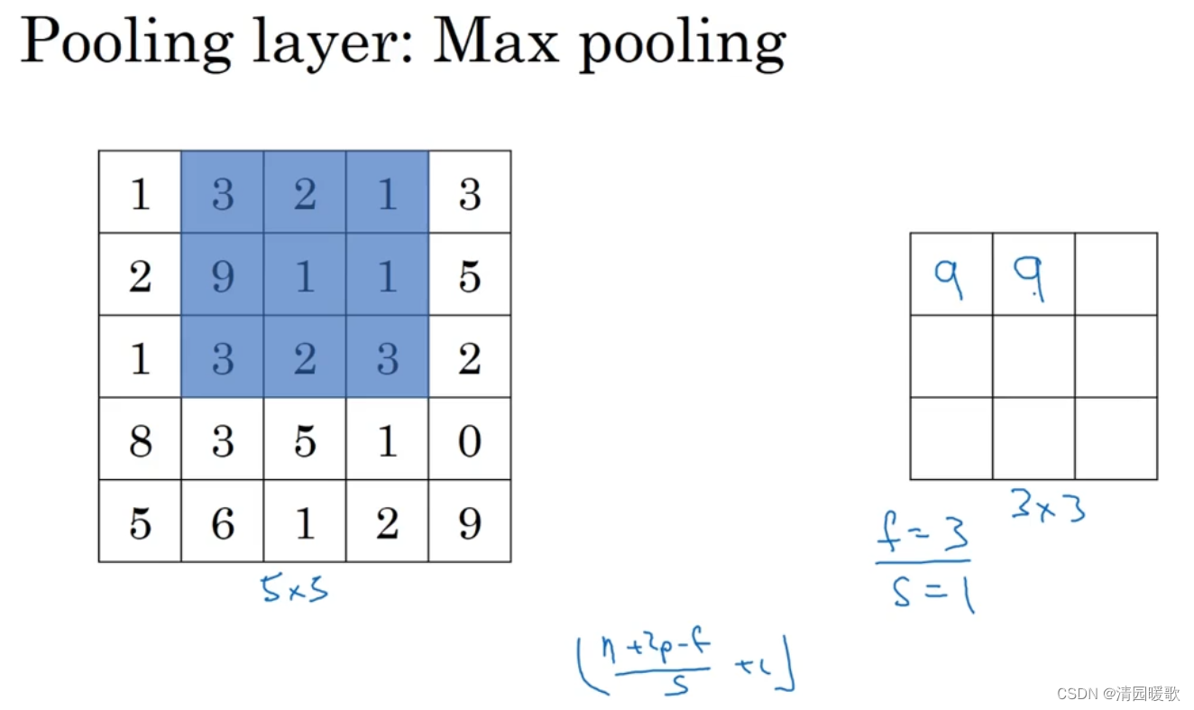 下面,输入为5×5的矩阵,假设3×3过滤器,即f=3,s=1,所以池化层的输出为