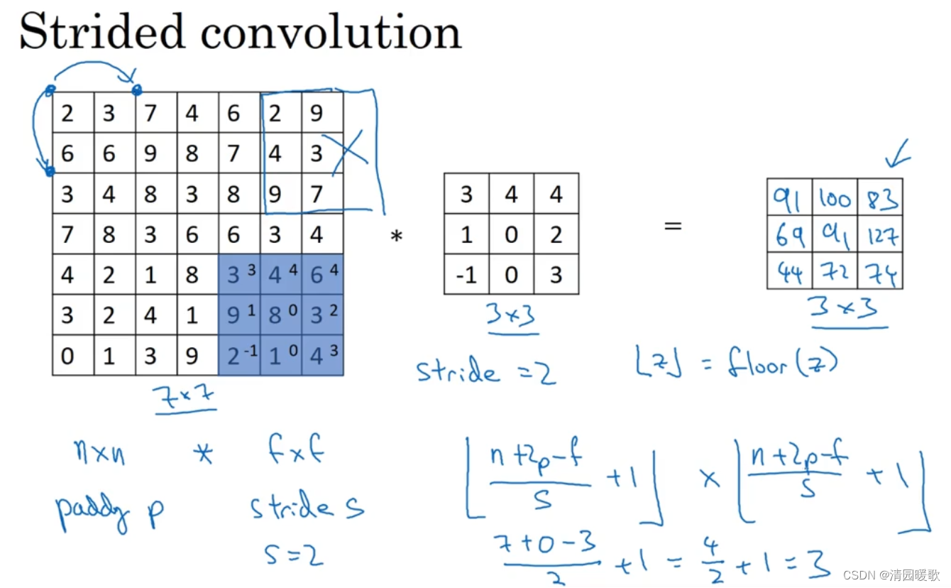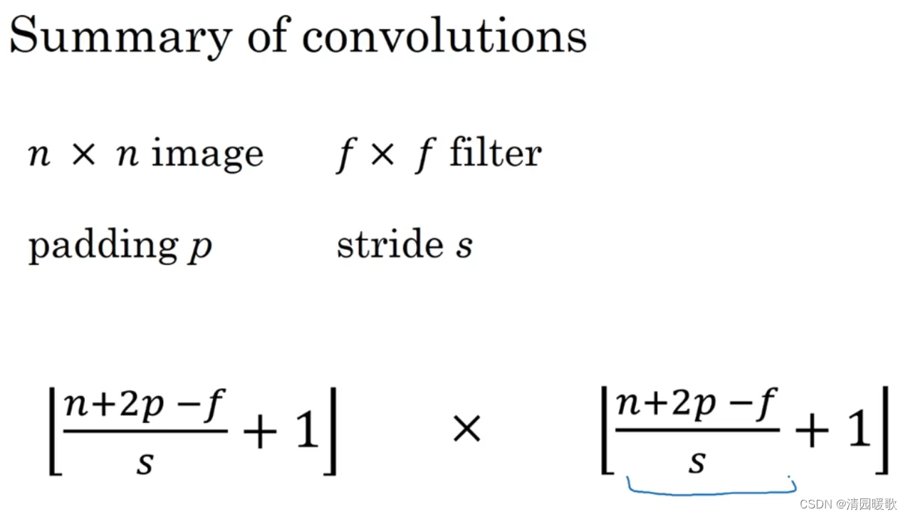 如果商不是一个整数,就向下取整,符号为:" |_ z_| ",也叫对 z 进行地板除,即将z向下取整到最近的整数,原则就是如果过滤器框超出就不进行卷积