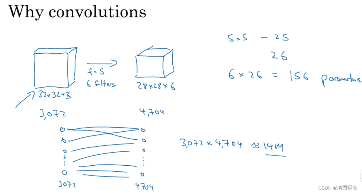 假设有 32×32×3 (3072个元素)的图片,用6个5×5 的过滤器,输出为 28×28×6(4704个元素),权重矩阵有 3072×4704 =1400万个参数;如果是1000×1000的图片,那么权重矩阵会更大