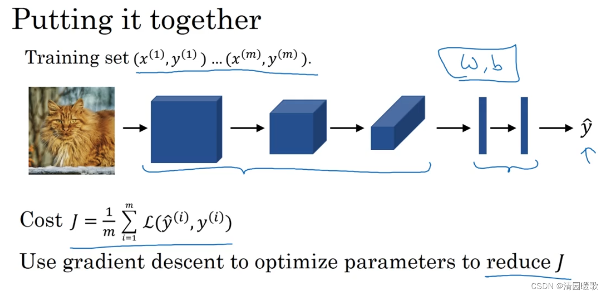 最后整合,训练神经网络,使用梯度下降算法或其他梯度下降来优化神经网络中的所有参数,以减少代价函数J的值,