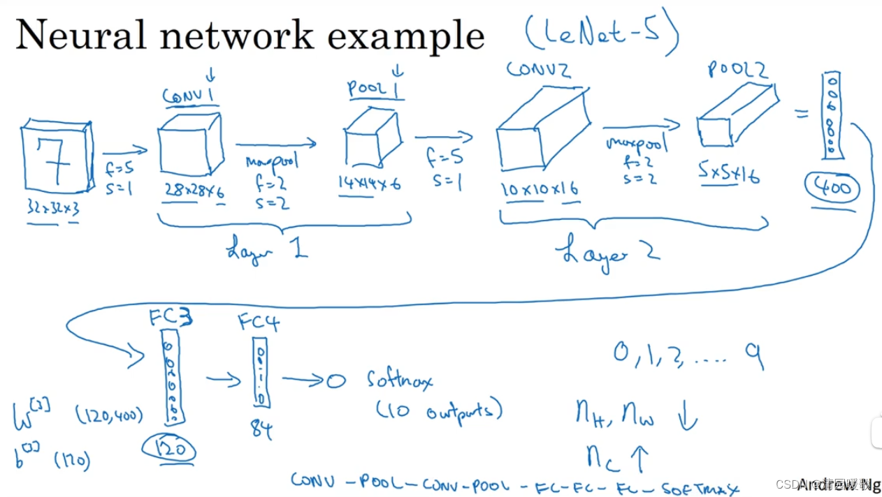 下例,假设有一张大小为 32×32×3 的输入图片,是RGB模式的,若想做手写数字识别,该图片含有某个数字,比如7,我们想识别他是0-9的哪个数字,构建神经网络来实现,这个网络模型和经典网络LeNet-5非常相似,灵感也来于此