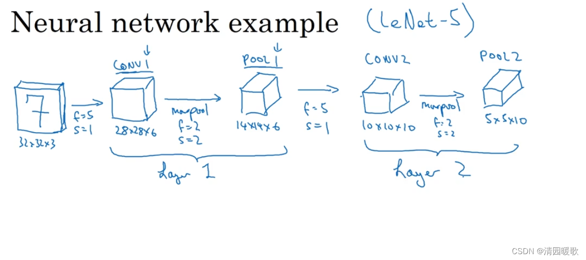 第一层过滤器f=5,s=1,p=0,6个过滤器,那么输出为 28×28×6 ,这层标记为 CONV1;构建最大池化层,f=2,s=2,输出为 14×14×6 ,标记为 POOL1;把 CONV1 和 POOL1共同作为一卷积层,标记为 Layer1;一般在统计网络层数时,只计算具有权重的层