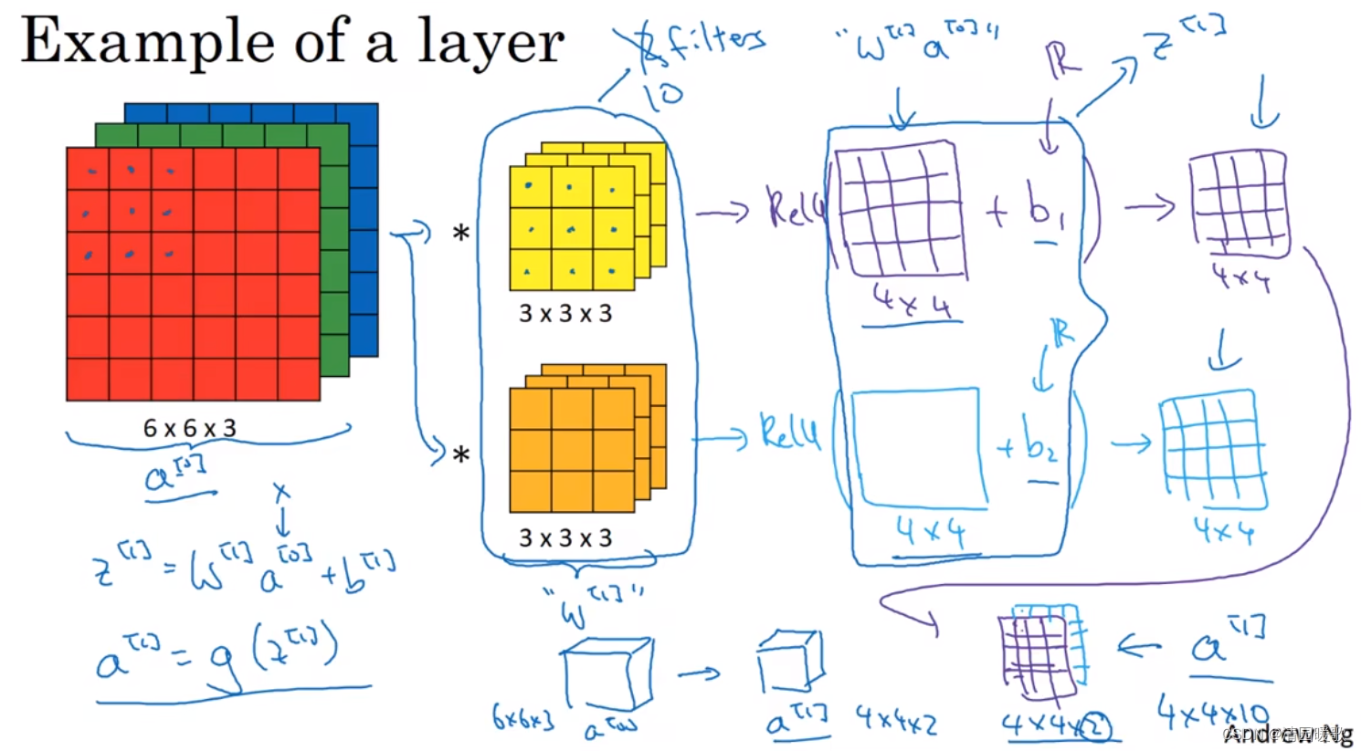 注意,前向传播其中一个操作就是z[1] = W[1] a[0] + b[1],a[0]相当于x,执行非线性函数,a[1] = g(z[1]),左边的 6×6×3 的输入就是a[0],就是x;过滤器用变量W[1]表示,输出结果相当于W[1] a[0] ,到加上b之前都是应用非线性函数ReLU之前的值,最后运用ReLU,称为神经网络的下一层,也就是激活层,这就是a[0]到a[1]的演变过程