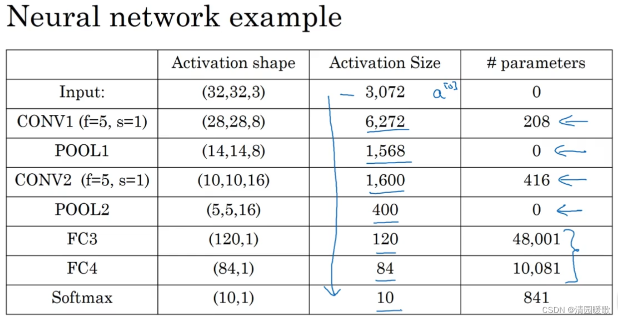 如果应用另一个卷积层,16个f=5,s=1的过滤器,CONV2输出为 10×10×16;执行最大池化f=2,s=2,输出为 5×5×16,为POOL2,有400个元素;将POOL2平整化为一个大小为400的一维向量,可以把平整化结果想象成这样一个神经元集合,利用这400个单元构建下一层,下一层含有120个单元,这就是我们第一个全连接层,标记为FC3;这400个的单元与这120个单元中的每一个连接,有参数w和偏差b,输出120个维度,再添加一个全连接层,假设这一层含有84个单元,标记为FC4;最后用这84个单元填充一个 softmax 单元,如果要识别0-9个数字,那么 softmax 就有10个输出,尽量不要自己设置超级参数,而实查看文献中别人采用的