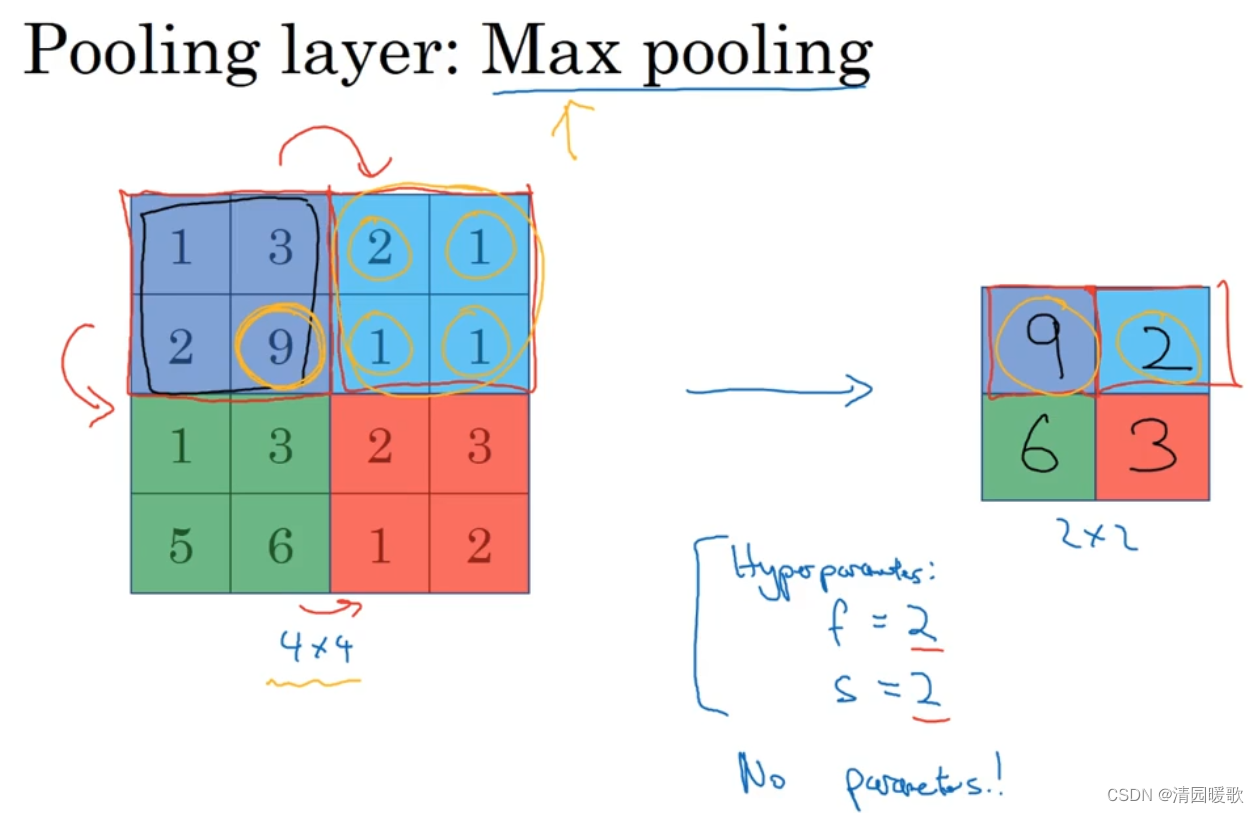 假设输入是一个4×4的矩阵,用到的池化类型是 最大池化(max pooling),执行最大池化的输出是一个2×2的矩阵;执行过程非常简单,把4×4输入拆分成不同的区域,对于2×2的输出,输出的每个元素都是其对应颜色区域中的最大元素值,为了得到输出的元素值,需要对输入矩阵的2×2区域做最大值运算,相当于应用了一个规模是2,即2×2的过滤器,步长也为2,这就是最大池化的超级参数,f=2,s=2