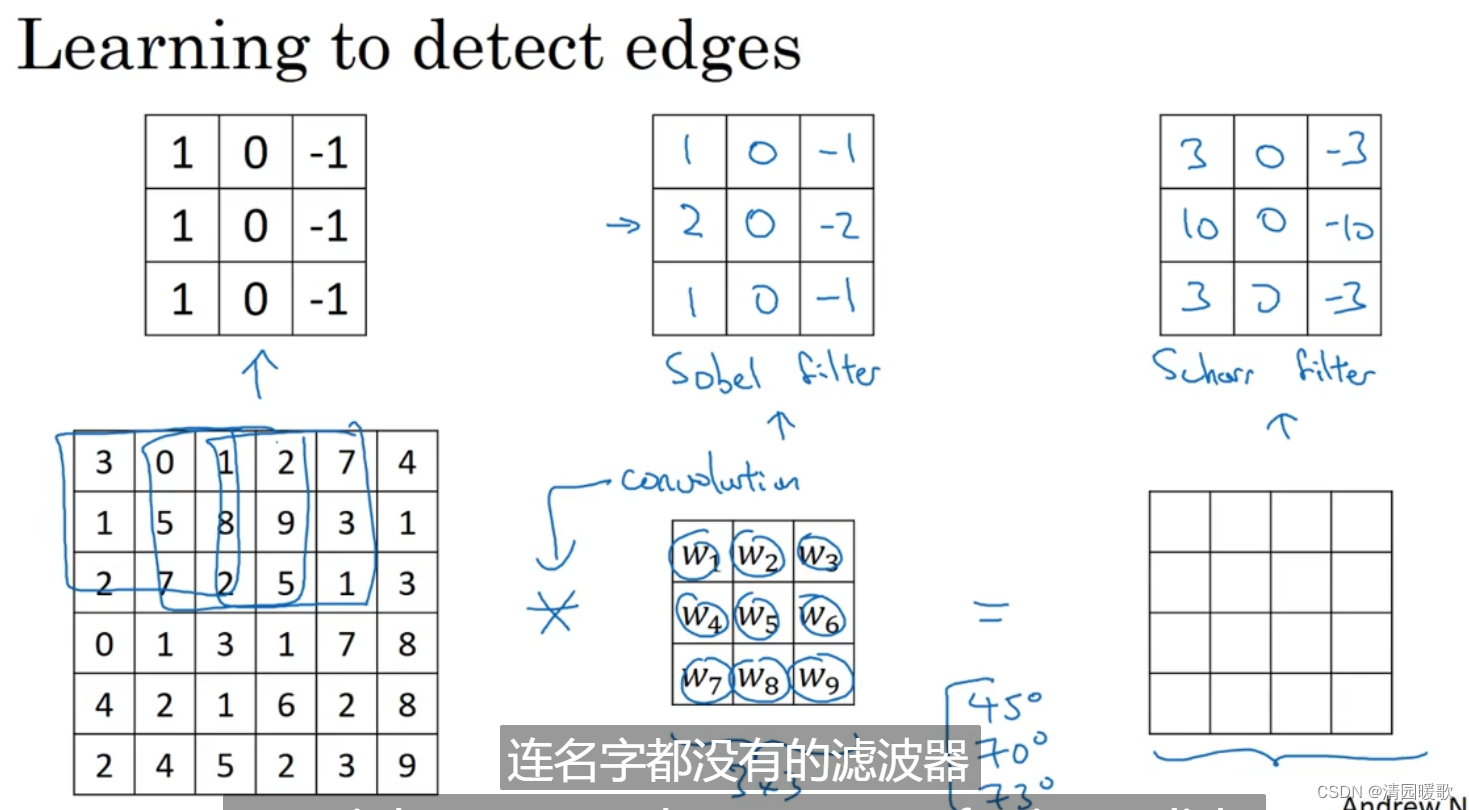 实际上的卷积操作,首先还要给过滤器再水平和垂直轴上做翻转,类似镜像, 将翻转后的矩阵作为过滤器。而我们的操作跳过了这个镜像操作,所以实际上我们之前做的操作有时被称为互相关,而不是卷积,但深度学习文献中,按照惯例,我们将这称为 卷积操作
