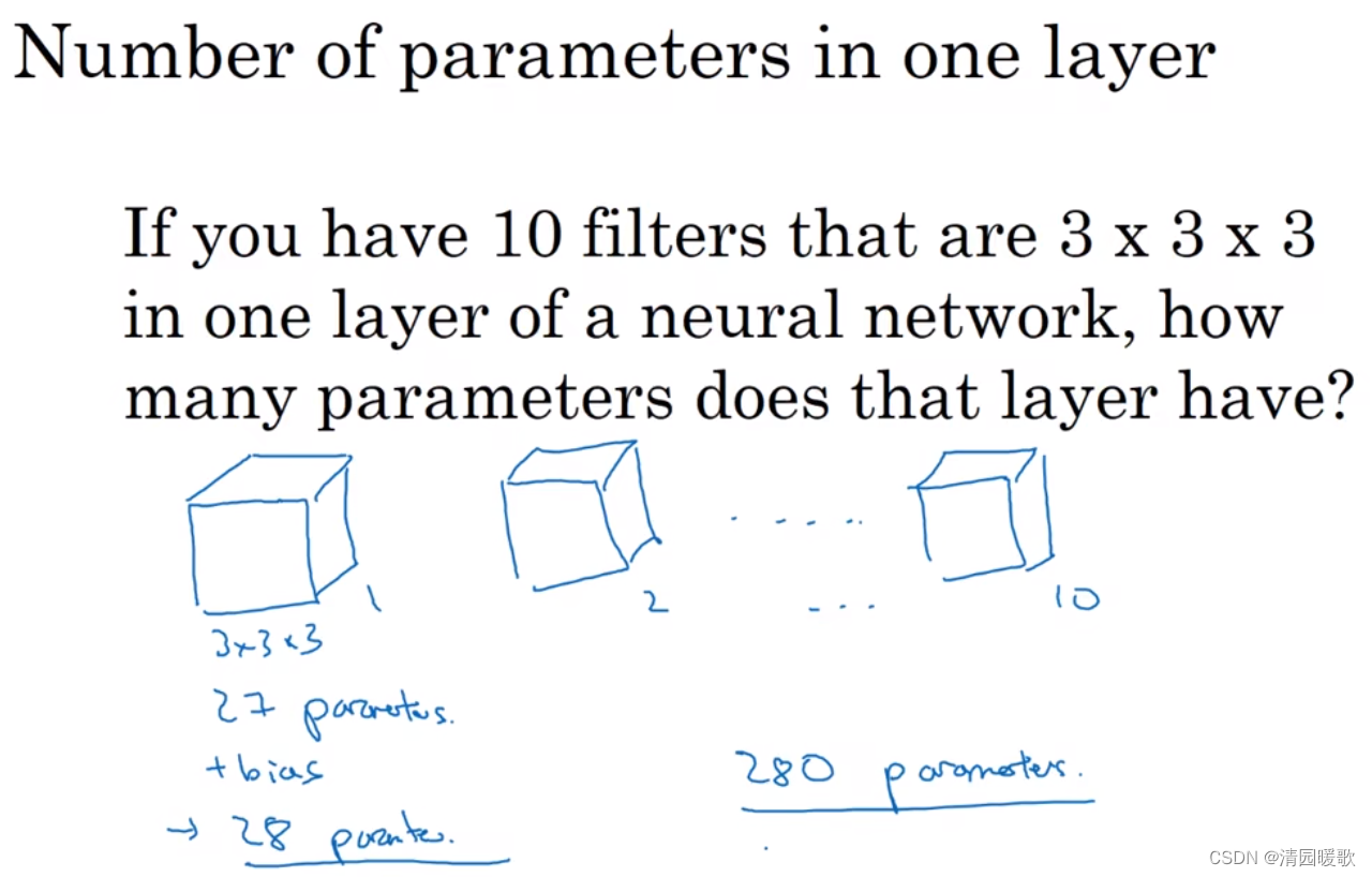 用10个3×3×3的过滤器,一个过滤器加上偏差就是28个,10个就是280个,无论输入的图片大小多大,是1000×1000,还是5000×5000,参数始终都是280个,这就是卷积神经网络的一个特征,叫做“避免过拟合”