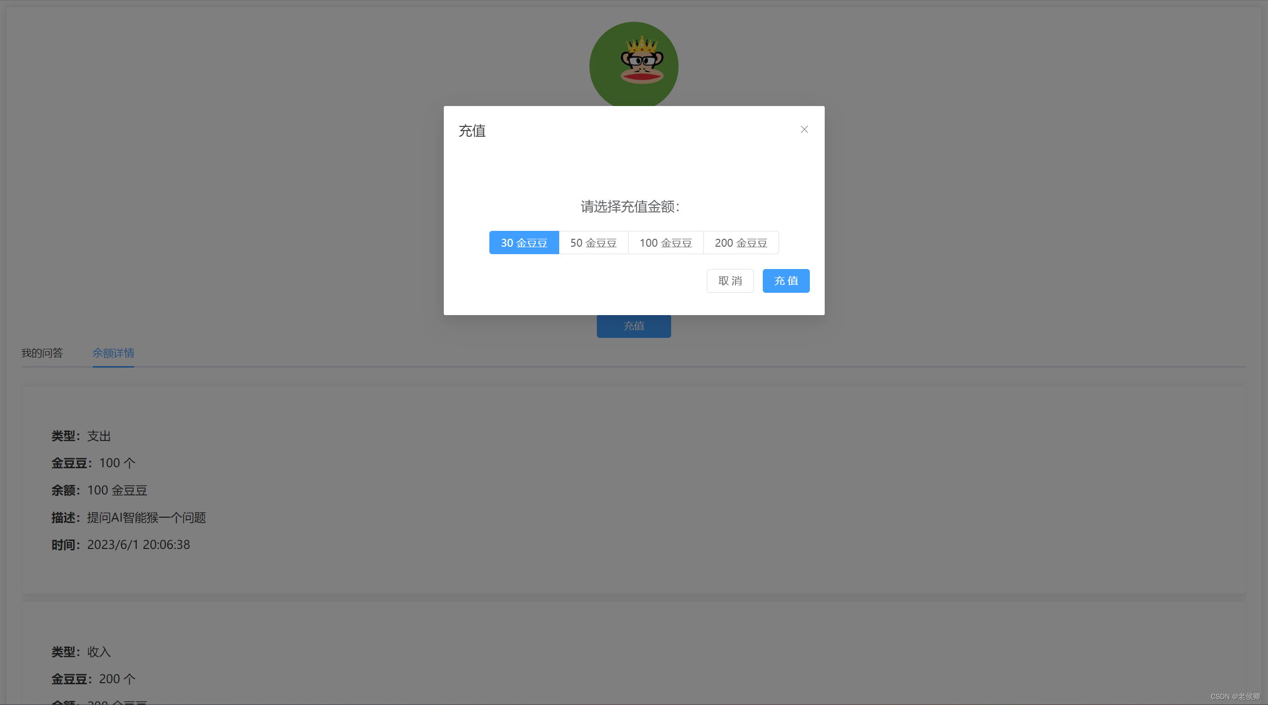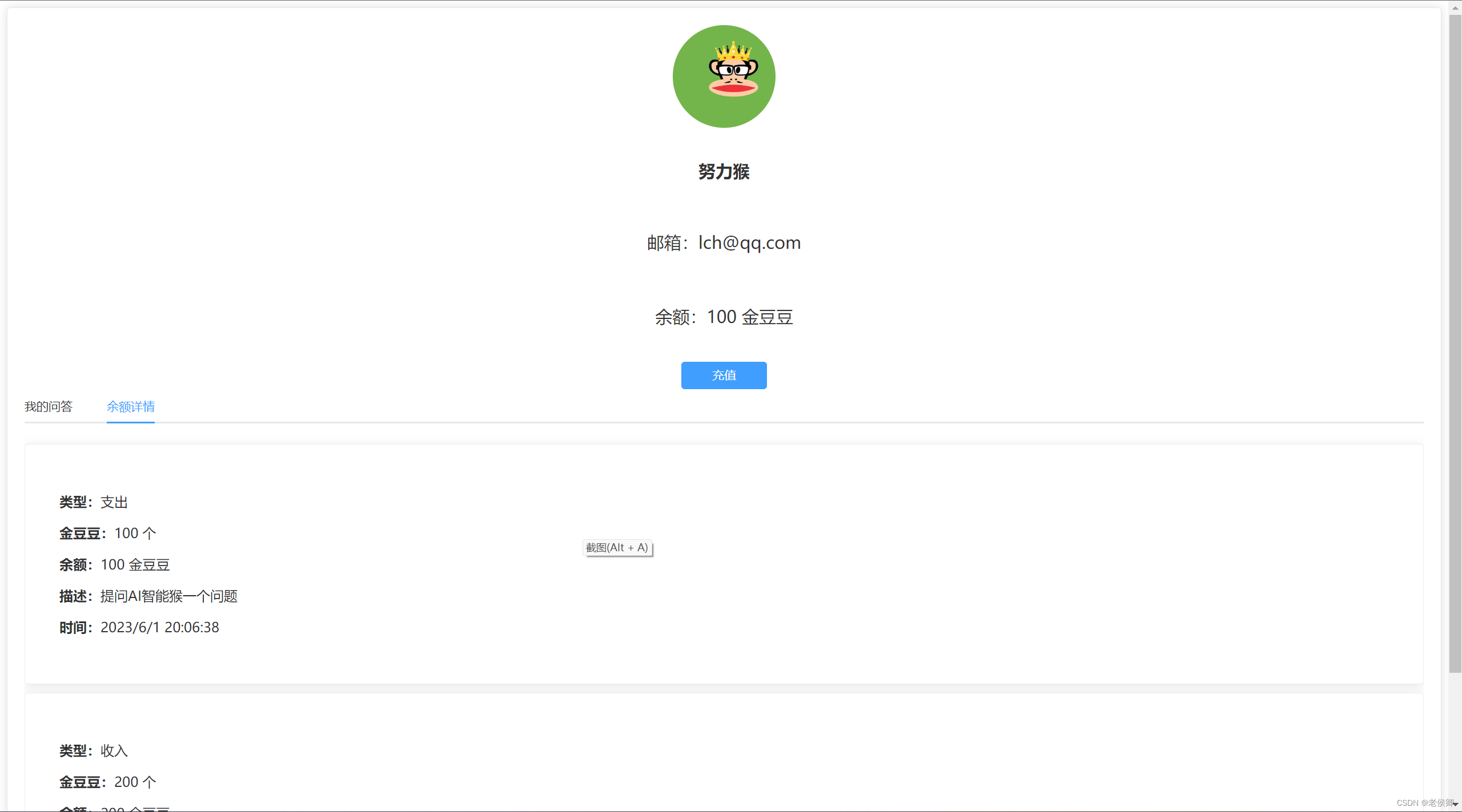 有对应余额功能,根据用户公开问题的浏览量获得收入,提问AI消费以及充值功能。